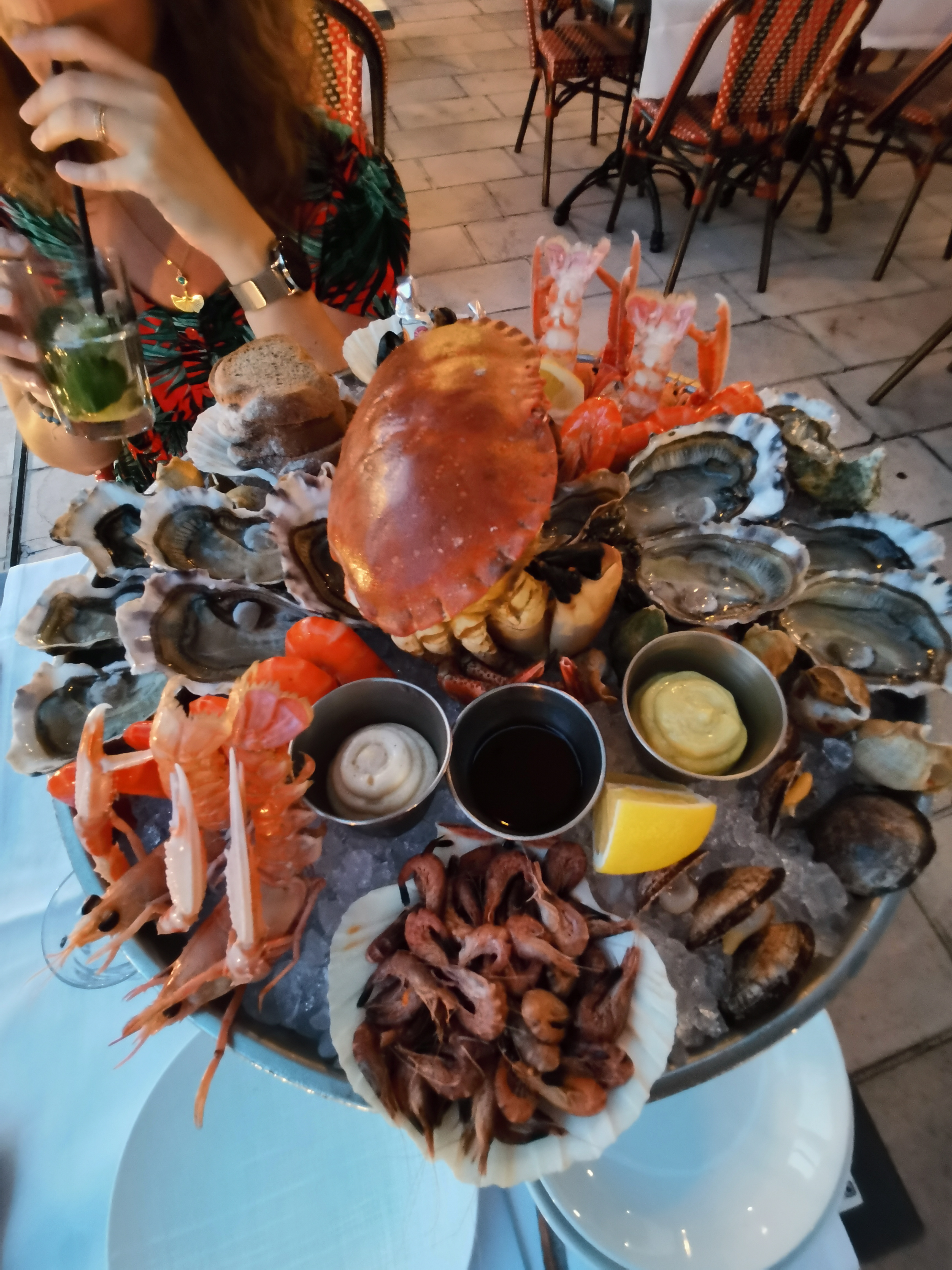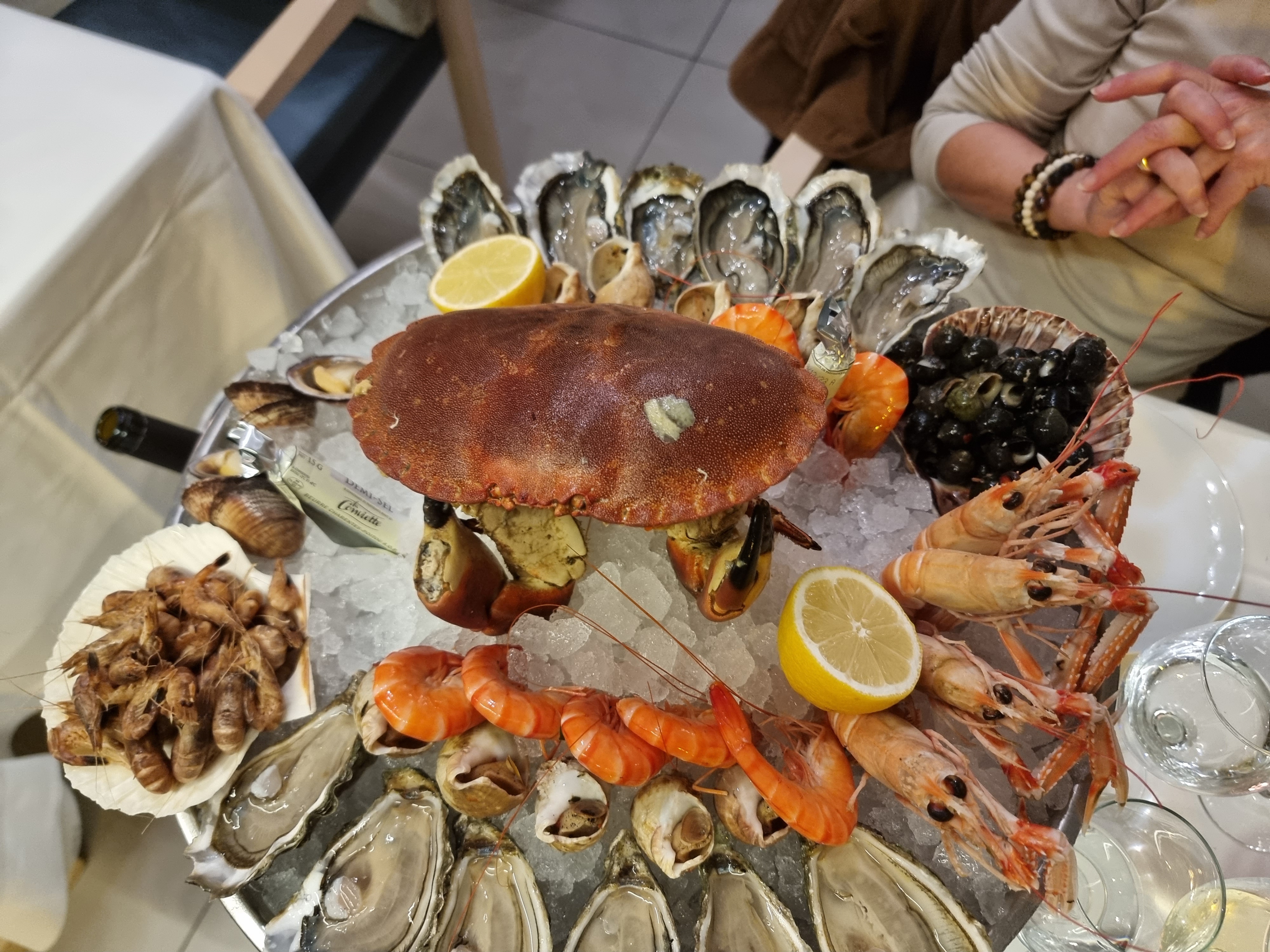 déjeuner pour ce faire un plateau de fruits de mer. jour de temps très pluvieux. plateau sur mesure avec les produits que l' on souhaiter et dessert pour finir
