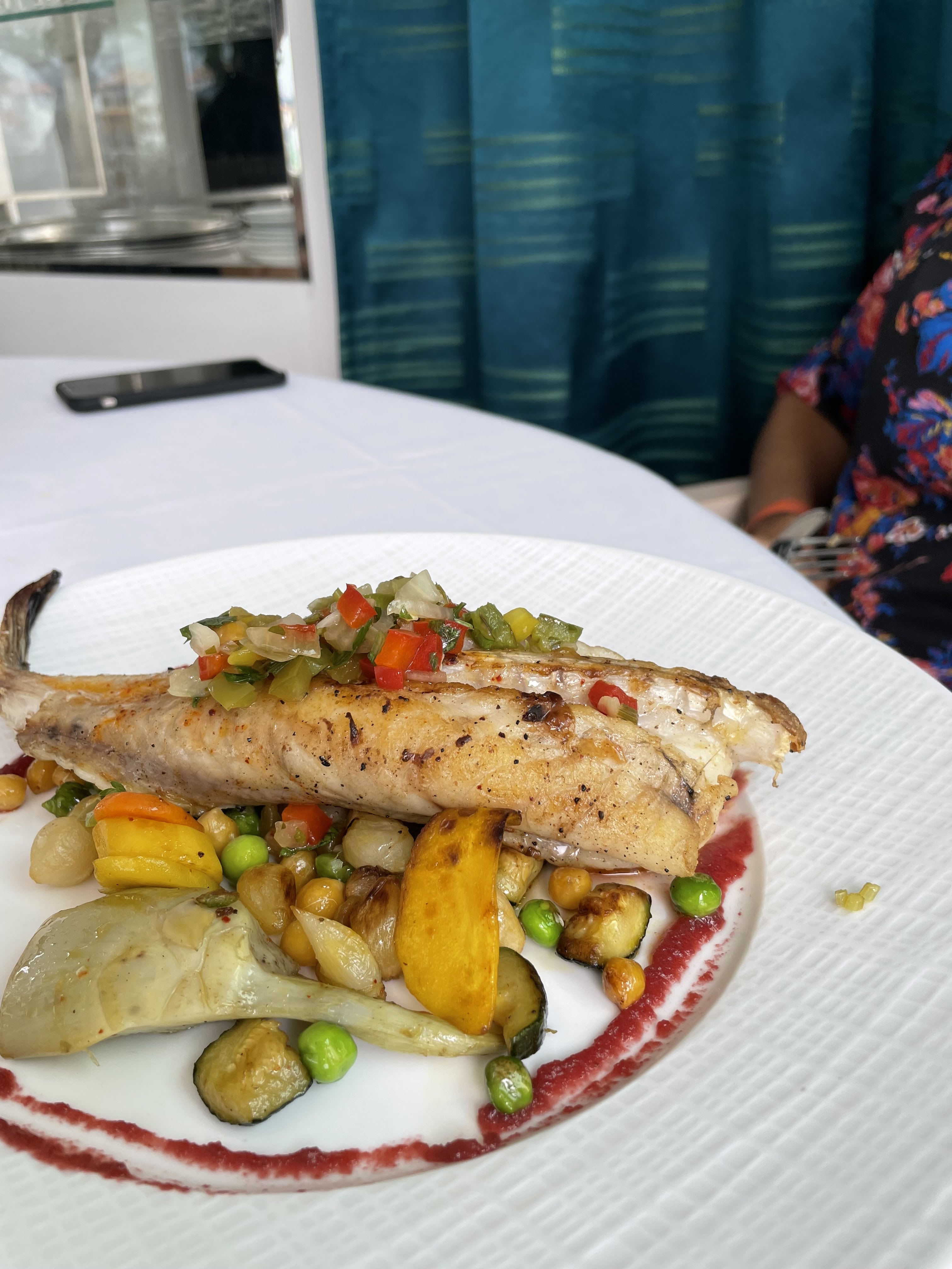 Bon repas avec de bons poissons! Le point noir: pas de glaçons car la machine est en panne, ça peut arriver mais on fait le nécessaire pour servir de l’eau fraîche et non tiède. Les carafes d’eau se fermaient elles auraient pu être mis au frais la moindre des choses puisque qu’ils n’y avaient pas de glaçon! Vu la chaleur on fait le nécessaire Dommage…étant dans la restauration on trouve une solution.